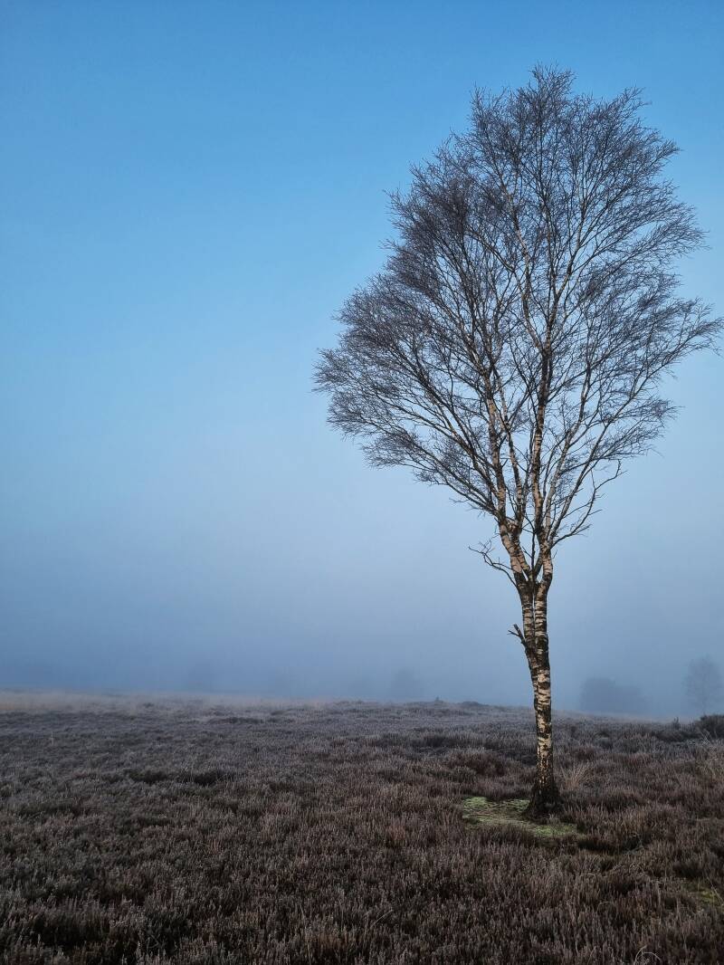 Mistige zonsopkomst op de hei, zon achter de bomen