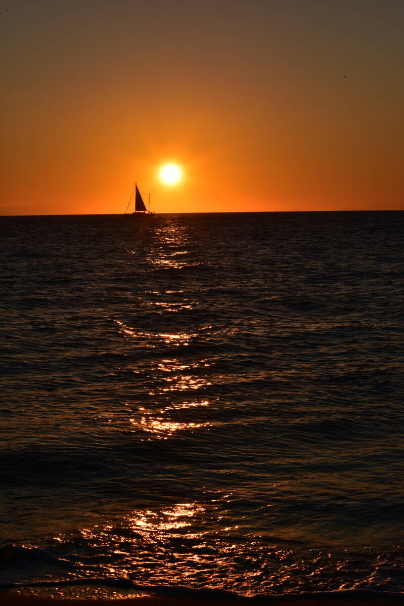 Zonsopkomst bij zee, rode lucht met zeilboot