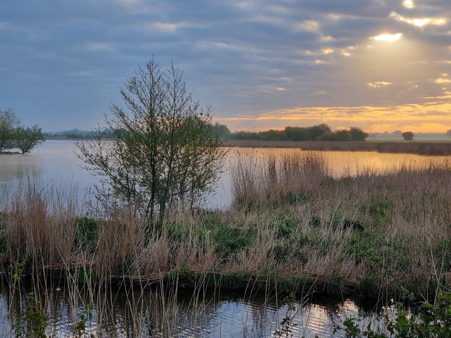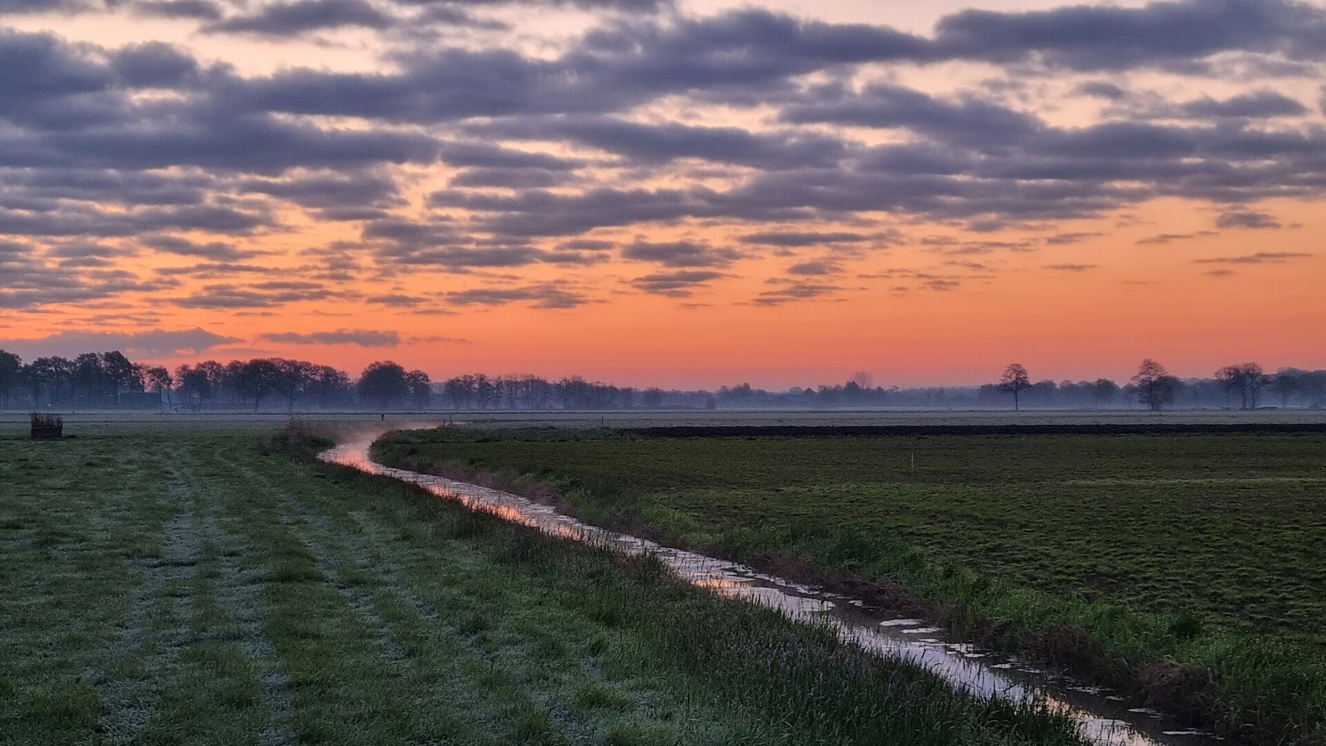 Oranje op Koningsdag 2022; Zonsopkomst in april (06.06 uur) Nunspeet - Veluwemeer. Mistbanken boven het water en grondmist op het land.